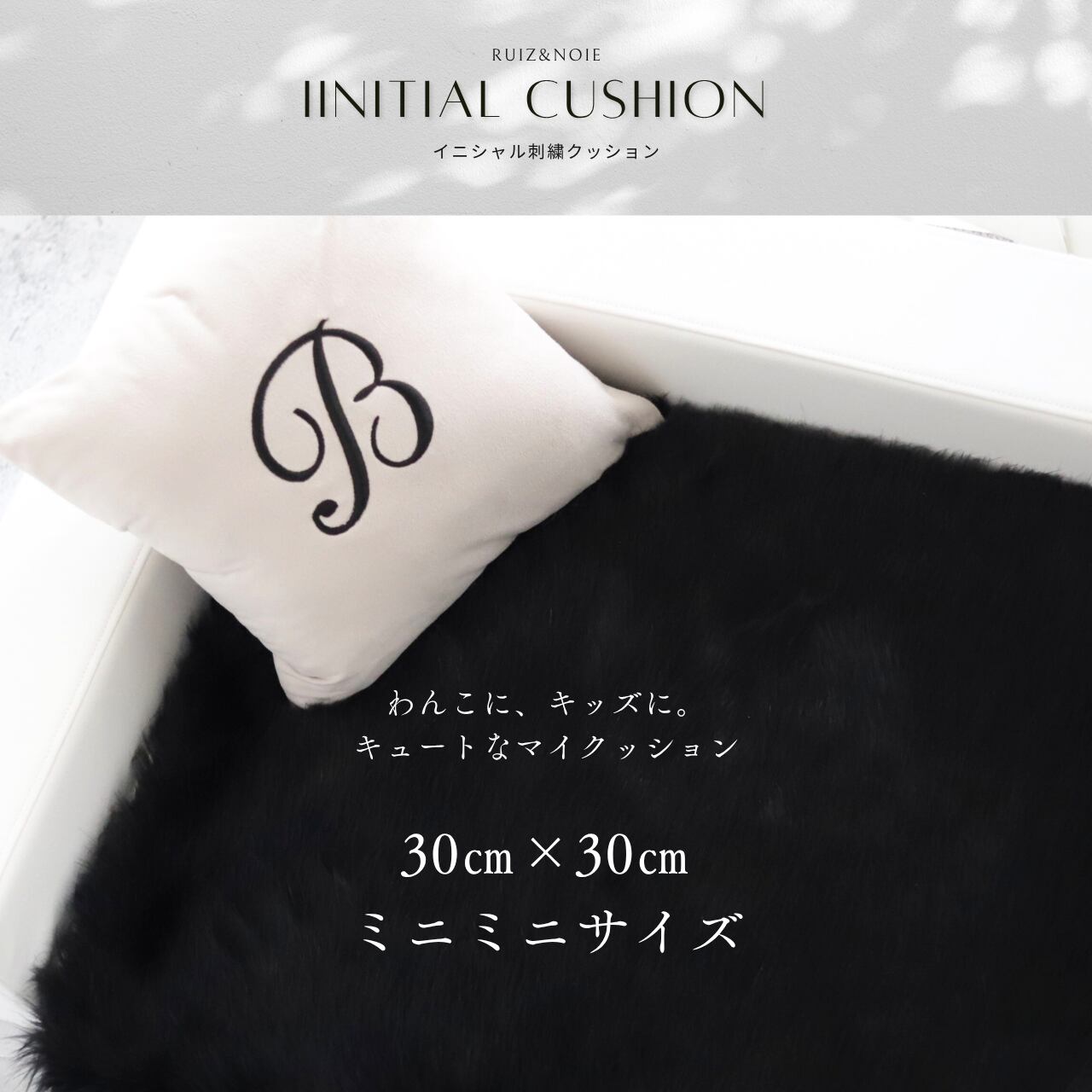 イニシャルが刺繍された、かわいくておしゃれな30cm角のミニクッション。肌触り抜群の柔らかいスエード生地を使用しています。この生地は、エコテックス認証という厳しい世界基準をクリアした安全性の高い生地。赤ちゃんやわんこにも安心してお使いいただけます。色味はシックなグレージュとグレー、どちらも少しくすんだインテリアに合わせやすい素敵なお色です。