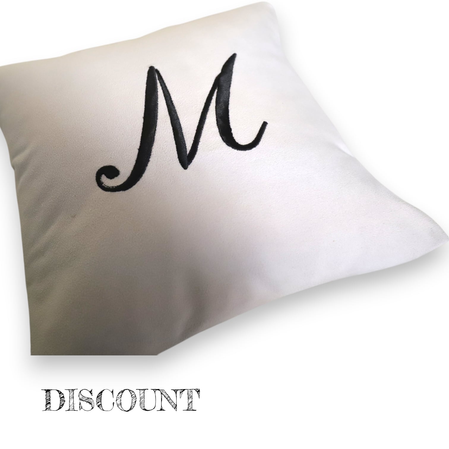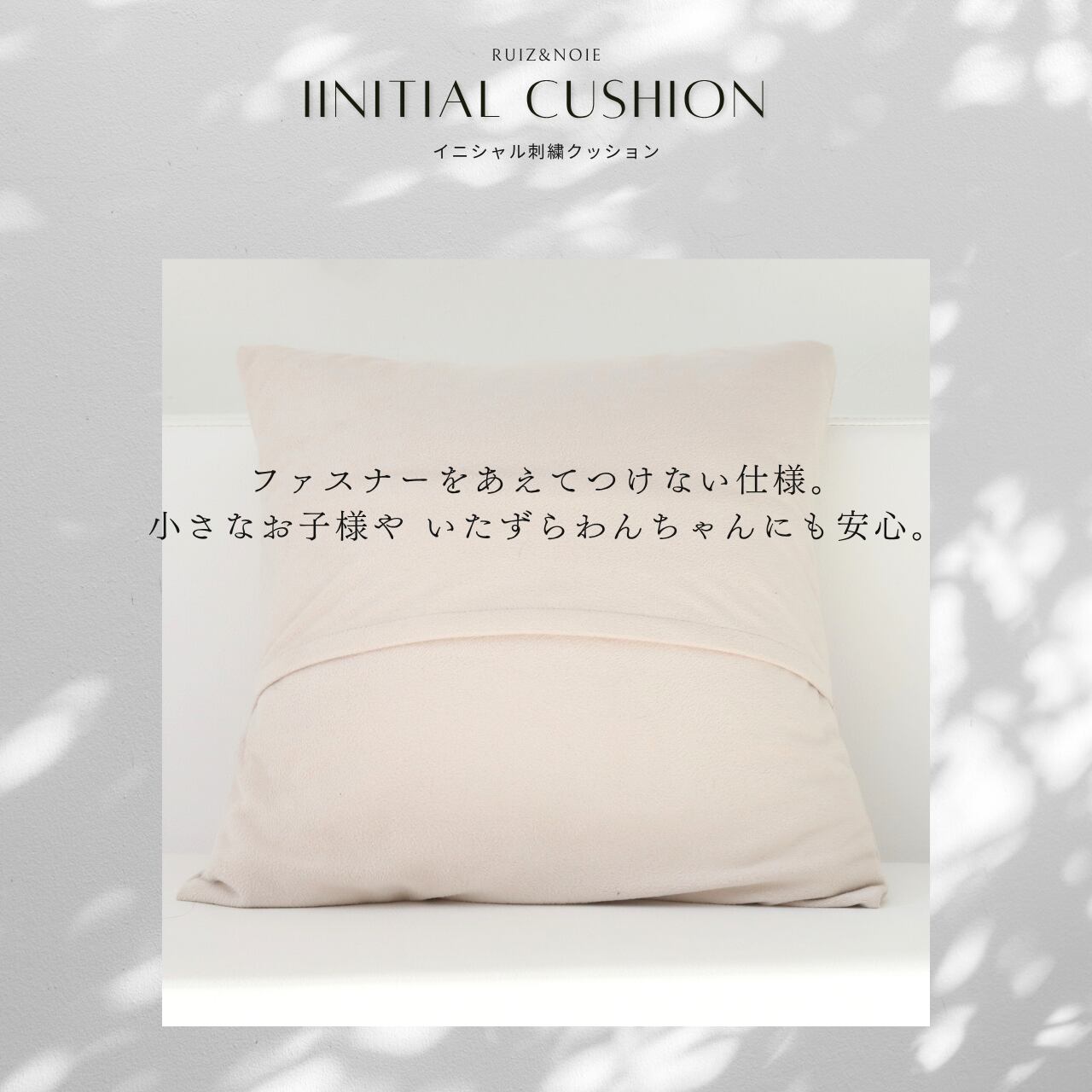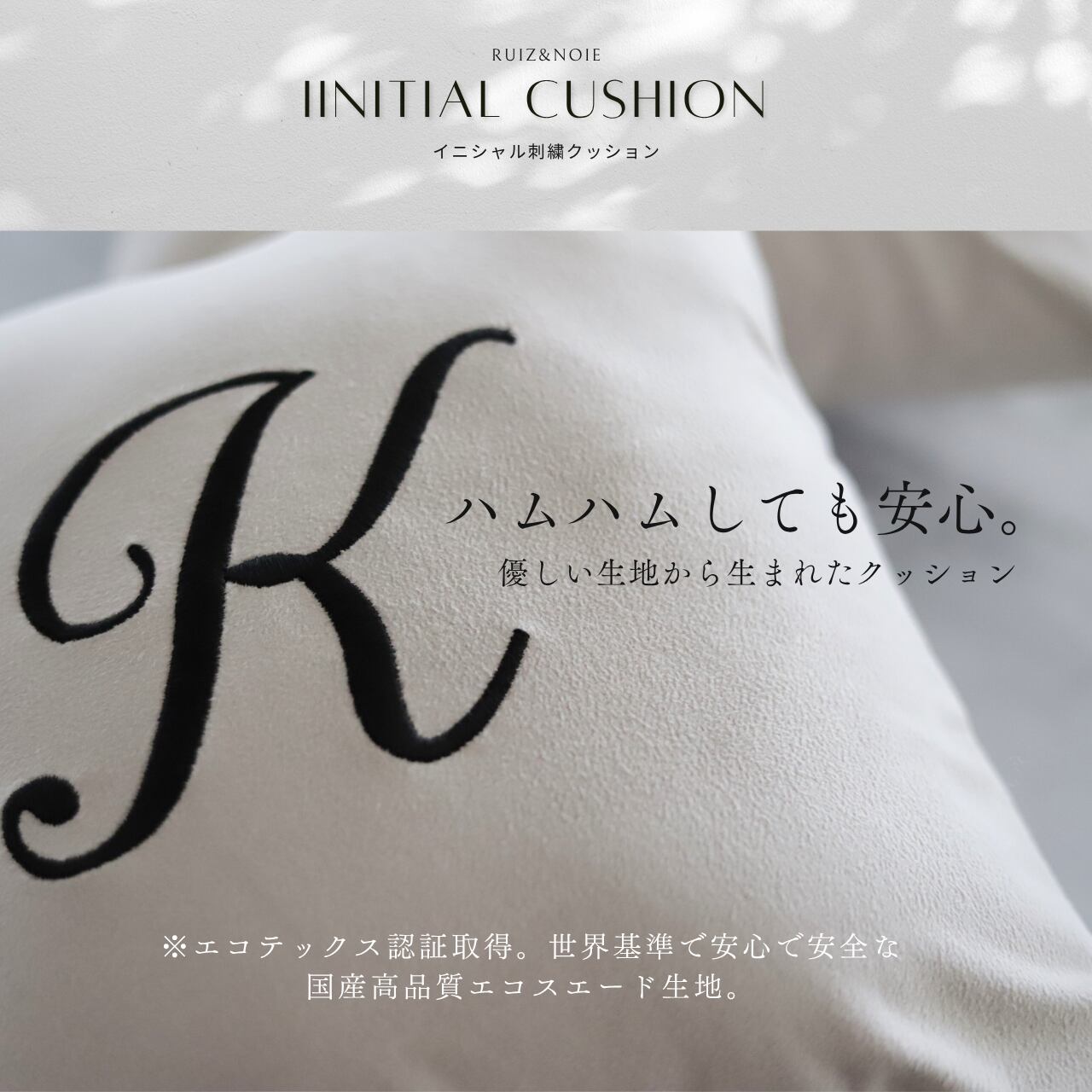 イニシャルが刺繍された、かわいくておしゃれな30cm角のミニクッション。肌触り抜群の柔らかいスエード生地を使用しています。この生地は、エコテックス認証という厳しい世界基準をクリアした安全性の高い生地。赤ちゃんやわんこにも安心してお使いいただけます。色味はシックなグレージュとグレー、どちらも少しくすんだインテリアに合わせやすい素敵なお色です。